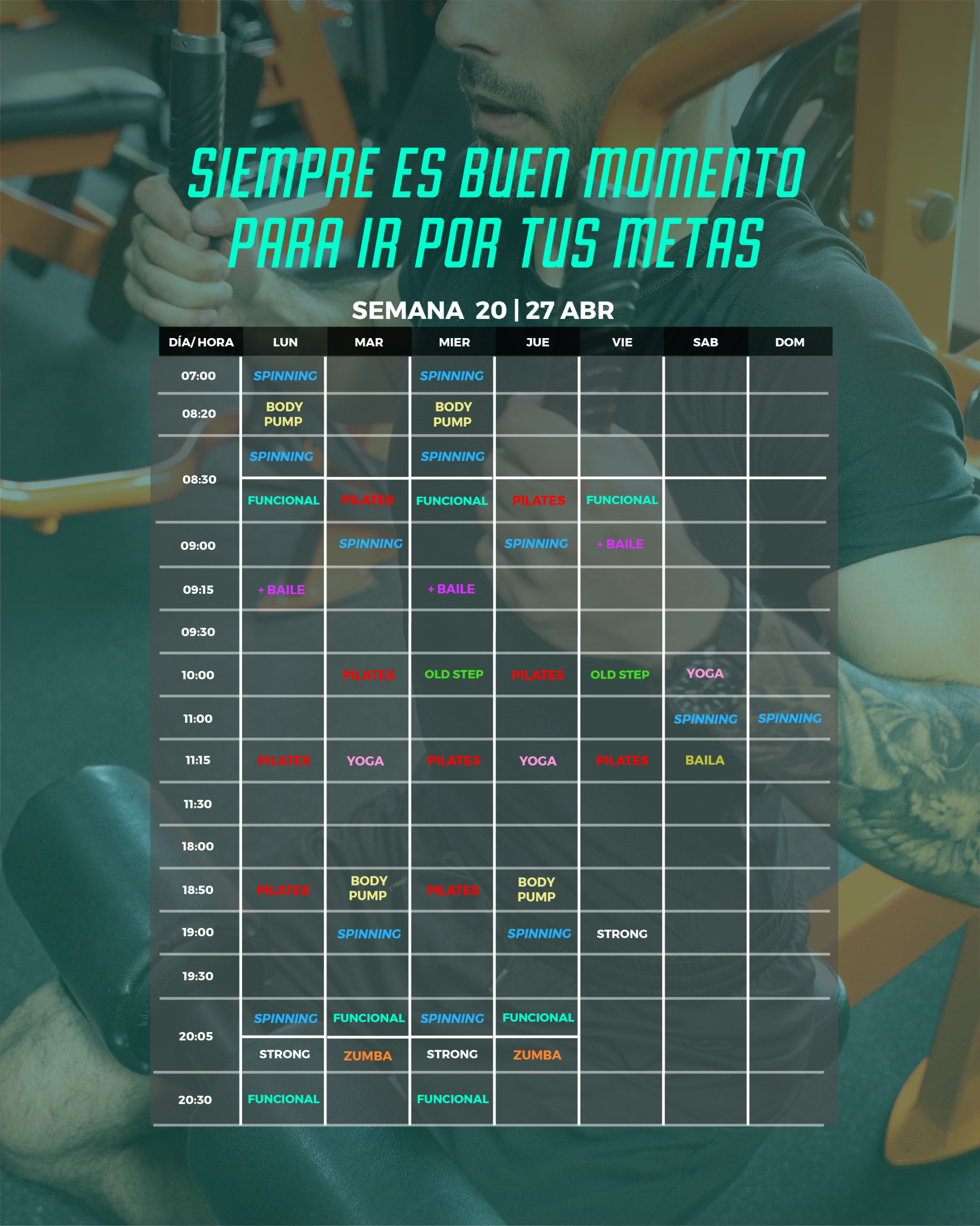 Mantenemos los mismos horarios que la semana pasada, RECUERDEN que hay una clase nueva de SPINNING los LUNES Y MIÉRCOLES a las 08:30 hrs.